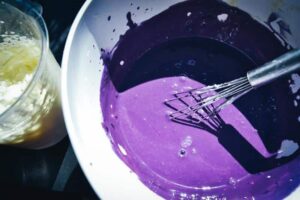 Nun die Brombeermarmelade mit der Gelatine nun in eine Schüssel geben und den Frischkäse - Joghurt darunter rühren, wer mag, kann damit die Farbe etwas intensiver ist eine Messerspitze Speisefarbe dazu geben, ich habe eine kleine Messerspitze Violet -Myrtelle von les-artistes- genommen.
