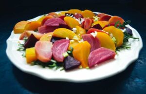 Leckerer vegetarischer bunter Rote Beete Salat mit Feta, Orangen, gelber Bete, Ringelbete, Pinienkernen. Das Dressing ist aus einem Feigen - Dattelessig und Olivenöl.