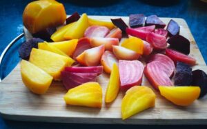 Die rote, gelbe und Ringelbeete in einem Topf mit Wasser bedecken und je nach Größe 45-60 Minuten auf kleiner Flamme kochen bis sie gar ist. Sie sollte aber nicht zu weich oder matschig gekocht werden. Ich pikse immer mit einem Messer in die Bete, um zu schauen, ob sie gar ist.