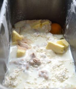 das Mehl mit der Hefe und dem Sauerteig Extrakt dem Ei und der Butter in einer Küchenmaschine oder wie ich im Brotbackautomaten verrühren