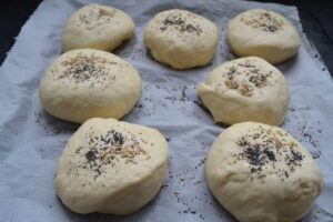 wer mag streut etwas Sesam und Mohn auf die Buns