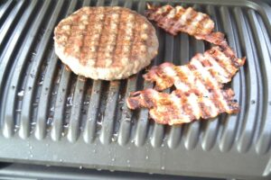 die Hirschpatties und Bacon auf dem Kontaktgrill grillen oder in der Pfanne braten. Mein Grill hat einen Sensor, der das Fleisch auf den Punkt grillt.
