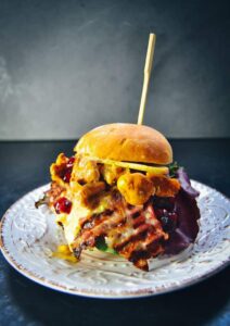 wer mag legt noch eine Scheibe Käse darauf, den man mit einem Gasbrenner, der ganz klein gestellt ist, zum Schmelzen bringen kann. Das Senfdressing und die Preiselbeersauce darüber tropfen und den Deckel vom Bun drauflegen