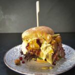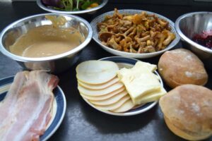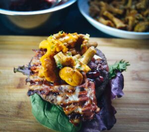 Leckeres saftiges Burger Rezept mit Hirsch und Pfifferlingen. Auf den Hirsch-Patti kommen gebratene Pfifferlingen, knuspriger Bacon, Birnenscheiben, ein Senfdressing, Preiselbeersauce und Raclettekäse.