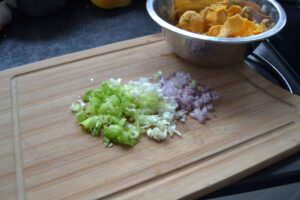 Die Pfifferlinge sehr gründlich mit einem Pinsel säubern und ein Stück vom Stiehl abschneiden. die Schalotte, Knoblauch und Lauchzwiebel schälen und klein würfeln. Petersilie waschen und hacken