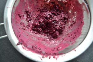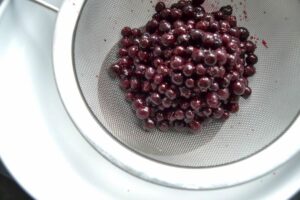 in ein Sieb geben und abtropfen lassen, den Saft auffangen, er wird später gebraucht, um damit den Fruchtspiegel zu machen