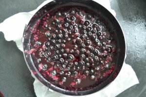 ca. 2 El schwarzes Johannisbeergelee auf den abgekühlten Boden streichen