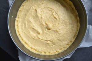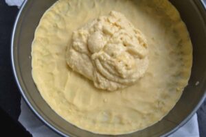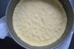 Eine Springform mit Backpapier auslegen, den Teig auf etwas Mehl dünn ausrollen und die Form auslegen und nur einen kleinen Rand formen.