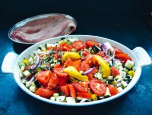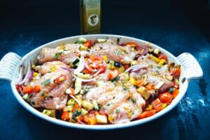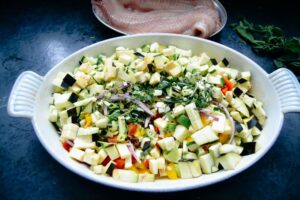 Leckeres Catfish Rezept, das Fischfilet im Backofen saftig auf einem mediterranen Gemüsebett mit frischen Kräutern und Tomaten gegart. Clara wurde auf der Stadtfarm in Berlin nach in der Aqua Terra Ponic einer Kreislaufwirtschaft nach dem Smart Urban Farming gezüchtet.
