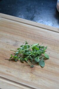 Die Blätter vomThymian, Oregano, Bohnenkraut von den Stengeln streifen und sehr klein hacken . Wer mag legt vor dem backen noch 2-3 kleine Thymian Stengel auf die Quiche . Knoblauch schälen und fein hacken
