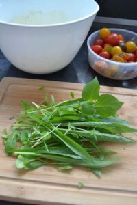 eine große Handvoll der gemischten Wildkräuter ( Spitzwegerich , wilde Rauke , grob kleinschneiden