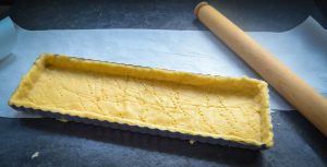 und dann in eine Tarteform füllen und mit einer Gabel den Teig mehrmals einstechen, mit einem Backpapier abdecken und das Papier mit Hülsenfrüchten befüllen und bei 190 Grad ca. 15 Minuten blind vorbacken.
