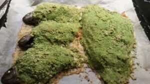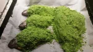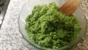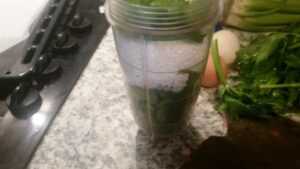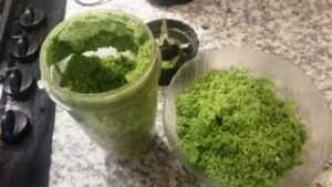 in mehreren Portionen so das grobe Salz mit dem Blattgrün fein mixen . Da ich dies mit einem kleinem Mixer gemacht habe muss man aufpassen das der Mixer nicht zu heiß wird.