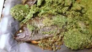Den Garpunkt des Fisches kann man dann gut an den Augen sehen . Den nun harten Salzmantel vor dem servieren aufbrechen und vorsichtig vom Fisch entfernen.