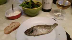 Bei mir gab es etwas Salat , Baguette und Aioli dazu . Die Aioli mache ich zuhause selber im Urlaub habe ich auf eine gute aus dem französischem Supermarkt zurück gegriffen .