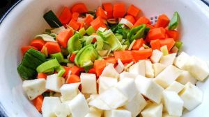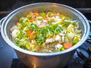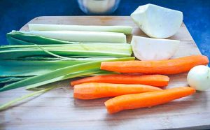 Porree in Ringe schneiden, Möhre und Sellerie würfeln. Die Kartoffelwürfel mit dem Suppengemüse zur Suppe geben und weiter auf mittlerer Temperatur kochen.
