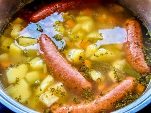 Omas einfaches Kartoffelsuppe Rezept, es gibt nichts Besseres als eine leckere, herzhafte, wärmende Kartoffelsuppe, die einen durch die kalte Herbst- und Winterzeit bringt. Die herzhafte Suppe mit Kartoffeln, Karotten, Lauch, Zwiebeln, Würstchen, Majoran und etwas Petersilie, schmeckt der ganzen Familie super lecker. Die Suppe wird 45 Minuten auf kleiner Flamme in einem Topf geköchelt.