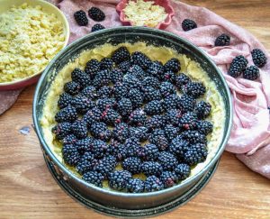 Fette den Rand und den Boden deiner Springform gut aus, gebe ca. knapp 2/3 vom Teig in die Form und drücke den Teig auf den Boden und forme einen kleinen Rand. Fülle dein Obst oder wie ich Brombeeren auf den Boden.