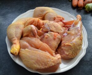 Alle Zutaten bereitstellen, die Maispoularde zerteilen erst die Keulen und Flügel abtrennen und dann die Brust halbieren.