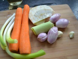 Möhren, Lauch , Sellerie , Knoblauch und Schalotten schälen dann