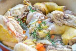die Möhren, das Lauch, Sellerie, Knoblauch und Schalotten würfeln. Das Gemüse zu der Hähnchenteilen geben und dem Riesling und der Hühnerbrühe angießen. Das Lorbeerblatt, Piment und Pfefferkörner dazu geben.