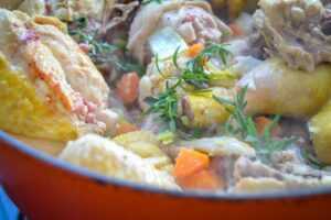 Das leckere Elsässer Riesling Huhn wird einige Stunden in Wein mariniert und dann mit Möhre, Lauch Schalotten angebraten und schmort im Ofen in der Marinade