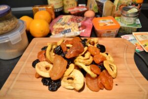 Die Trockenfrüchte in kleine Würfel schneiden. Von den Orangen die Schale abreiben und die Früchte auspressen