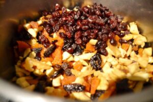 Die Trockenfrüchte mit dem Orangensaft und dem Sherry in einem Topf erhitzen und einmal aufkochen. Nun 50 ml Brandy oder Weinbrand unter die Früchte rühren und über Nacht an einem kühlen Ort durchziehen lassen.