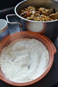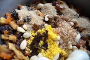 Am nächsten Tag die ganzen Gewürze und eine Prise Salz mit der geriebenen Orangenschale zu den Trockenfrüchten geben. Die Butter leicht erwärmen und unter die Fruchtmasse rühren. Die Zimtblüten im Mörser zerdrücken und mit dem Zucker unter die Trockenfrüchte rühren. Die Eier kurz verrühren und mit