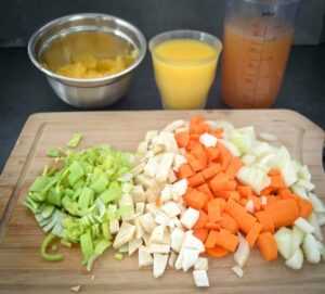 Das Suppengemüse waschen und putzen und in kleine Würfel schneiden, die Zwiebel schälen und würfeln. Die Orangen schälen und mit einem scharfen Messer die einzelnen Orangenspalten aus der Haut filetieren. Die Reste der Orangen mit dem