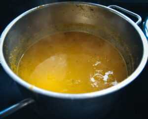 Die Entenkeulen nach. 50 min. kurz aus dem Bratenfond nehmen, um den Bratenfond für die Orangensauce mit dem Gemüse in einen Topf zu gießen. Die Temperatur im Ofen auf ca. 190-200 Grad stellen und die Keulen je nach Größe weitere 15-20 min. knusprig braun braten.