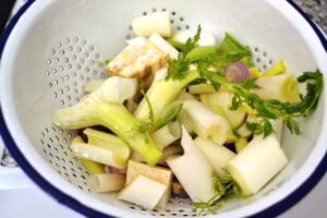 den Fenchel, die Sellerie und das Lauch waschen und kleinschneiden. Schalotten und Knoblauch schälen und auch klein würfeln. Alles mit den Gewürzen zu den Gräten geben und aufkochen. Den Schaum