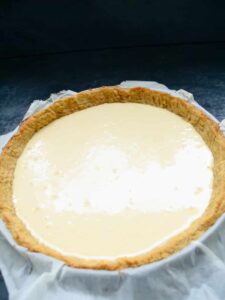 Den Crème fraîche Guss auf den blind vor gebackenen Tarte Boden füllen