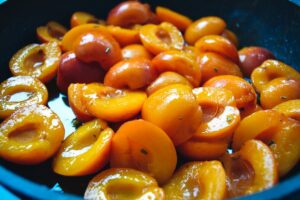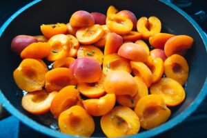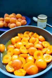 Die halbierten Aprikosen zufügen und alles auf kleiner Flamme ca.4-5 Minuten köcheln. Aufpassen, damit die Aprikosen nicht zu weich werden.