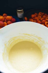 Die Crème fraîche mit den Eiern, 2 EL Rosmarin, Speisestärke und ca. 3 EL von dem Aprikosen Sud verrühren.