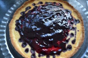 Den Mandelboden mit 3 EL Heidelbeerkonfitüre in der Mitte bestreichen, aber einen freien Rand stehen lassen.