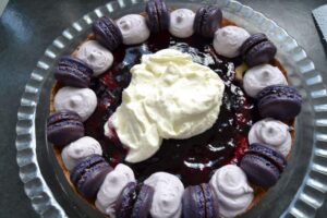 Die Mascarpone Creme mit dem Spritzbeutel mit einer großen Lochtülle an dem Rand dicke Tupfer setzen und zwischen jedem Tupfer einen mit Blaubeerkonfitüre gefüllten Macaron setzen in die Mitte kommt die Sahne