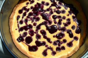 mit 1/3 Blaubeermarmelade, die in einem Spritzbeutel gefüllt ist in dem Kuchen Löcher stechen und mit der etwas flüssigeren Marmelade füllen
