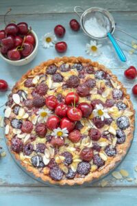 Die Kirsch Tarte nach dem Backen mit etwas Puderzucker bestäuben und wer mag legt noch ein paar frische Kirschen zur Deko auf den Kuchen.