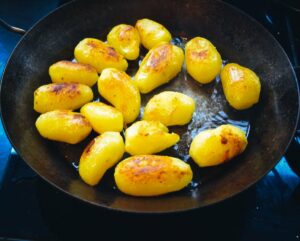 in einer großen Pfanne das Butterschmalz erhitzen und die Kartoffeln anbraten etwas Puderzucker über die Kartoffeln sieben und 4-5 Minuten knusprig braten