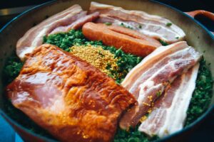 Das Kassler die Mettwürstchen und das Bauchfleisch mit den Senfkörnern zum Grünkohl geben und etwas unterheben