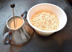 Den Grünkohl kann man heute schon fertig geputzt auf dem Markt und im Supermarkt kaufen, sodass er nur noch gründlich gewaschen werden muss. Dies mache ich in meiner Salatschleuder mit sehr heißem Wasser, sodass er schon etwas zusammen fällt und schleuder ihn dann auch gleich damit trocken. Wer ihn weniger kräftig mag, brüht ihn ab. Die Zwiebeln schälen und würfeln