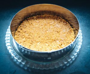 Einen Tortenring auf eine Tortenplatte stellen und die zerkleinerten Kekse mit der Butter gut vermischen. Die Spekulatius Masse auf dem Boden etwas festdrücken, sodass ein glatter Boden entsteht.