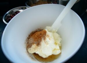 Den Frischkäse mit dem Zimt, Zitronensaft, und den gemahlenen Haselnüssen verrühren.