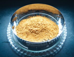 Die Spekulatius im Mixer sehr fein zerkleinern oder die Kekse in einen Gefrierbeutel füllen und mit einem Nudelholz zerkleinern. Die Butter in der Mikrowelle schmelzen.