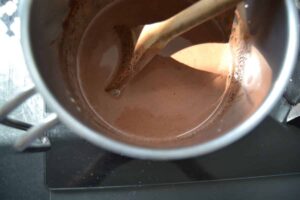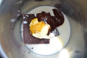 Die Milch mit der gehackten Kuvertüre, Honig und Butter erwärmen
