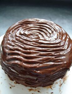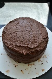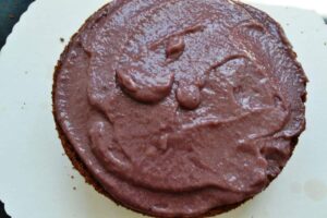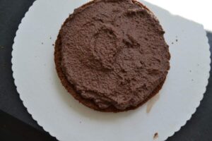 den oberen Boden darauf setzen und mit der restlichen Mousse au Chocolat die Torte einstreichen. Die Torte ca. 1 Stunde im Kühlschrank kühlen