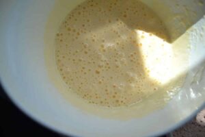 und gut rühren bis sich alles gut vermengt hat und den Guss dann abkühlen lassen. Er soll dick flüssig, fast kalt sein