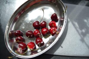 wer mag, kann einige Kirschen in etwas geschmolzene Kuvertüre tauchen und die Torte mit den Kirschen verzieren.