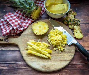 Den Strunk der Ananas und das Ende mit einem scharfen Messer abschneiden, danach die Ananas schälen, vierteln und den harten Mittelteil entfernen. Das Fruchtfleisch in kleine Würfel schneiden.